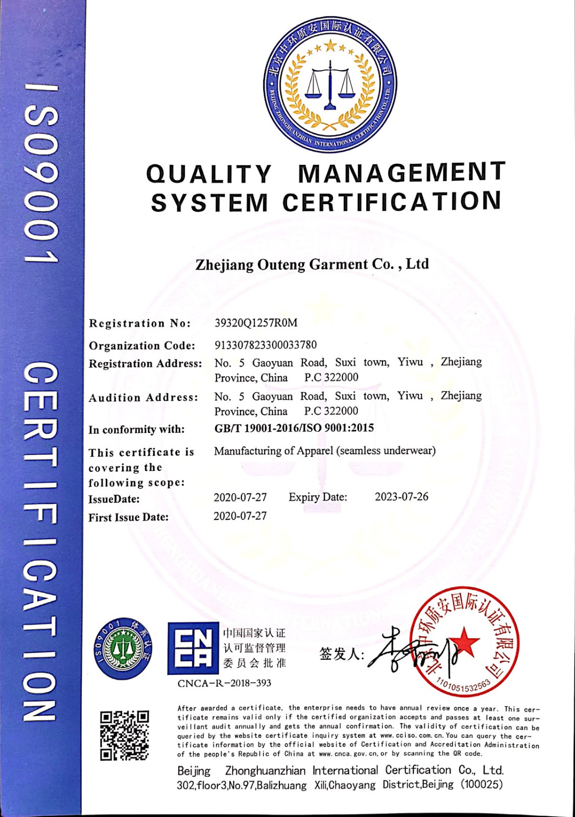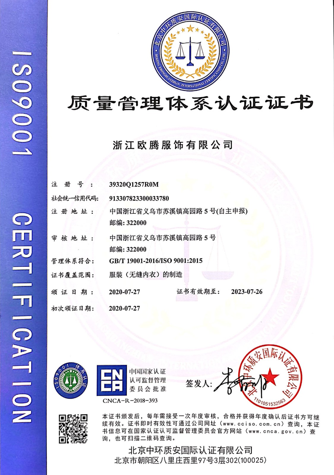 浙江歐騰服飾有限公司位于世界小商品之都-義烏。創(chuàng)立于2015年,是一家專業(yè)生產(chǎn)無縫針織運(yùn)動服飾和內(nèi)衣的工貿(mào)一體企業(yè),擁有自主出口權(quán)。 工廠的占地面積約16000平方米 ,引進(jìn)了大型圣東尼、高騰等多種先進(jìn)的制衣設(shè)備300余臺。月產(chǎn)能可達(dá)90萬件。 歐騰服飾每年投入近百萬資金打樣開發(fā)新產(chǎn)品,有著一支高素質(zhì)設(shè)計(jì)、技術(shù)員工隊(duì)伍。工廠先后通過了ISO 9001質(zhì)量管理體系認(rèn)證、BSCI認(rèn)證、GRS認(rèn)證、OEKO-TEX國際生態(tài)紡織品認(rèn)證等多項(xiàng)專利檢測報(bào)告。可提供OEM&ODM服務(wù)。歐騰服飾以一套完整、科學(xué)的質(zhì)量管理體系,生產(chǎn)的服裝從原材料紗線到成衣,質(zhì)量完全能夠滿足國內(nèi)、國際質(zhì)量要求。獲得了客戶一致好評。工廠先后獲得省科技型企業(yè)、國家高新企業(yè)、義烏市誠信講信用單位、規(guī)上企業(yè)、信用AAA級等榮譽(yù)。